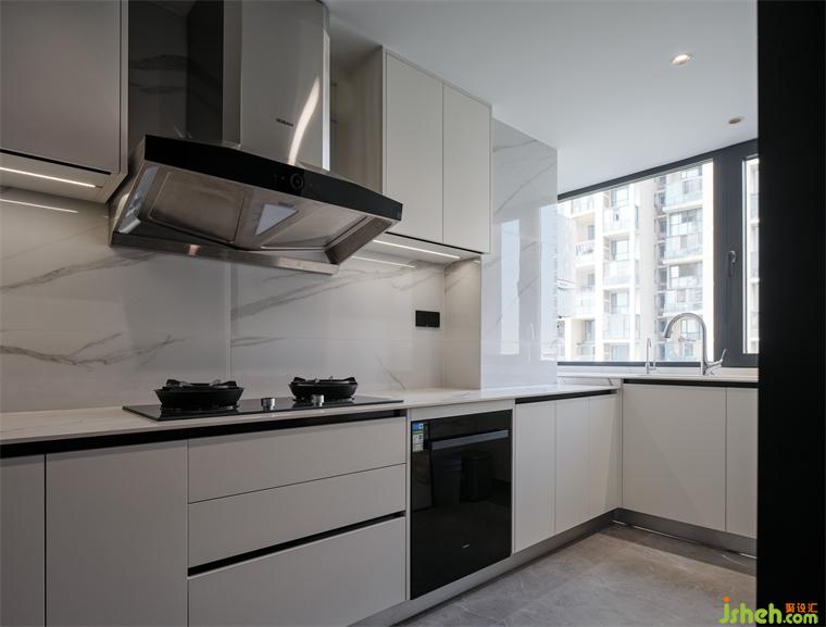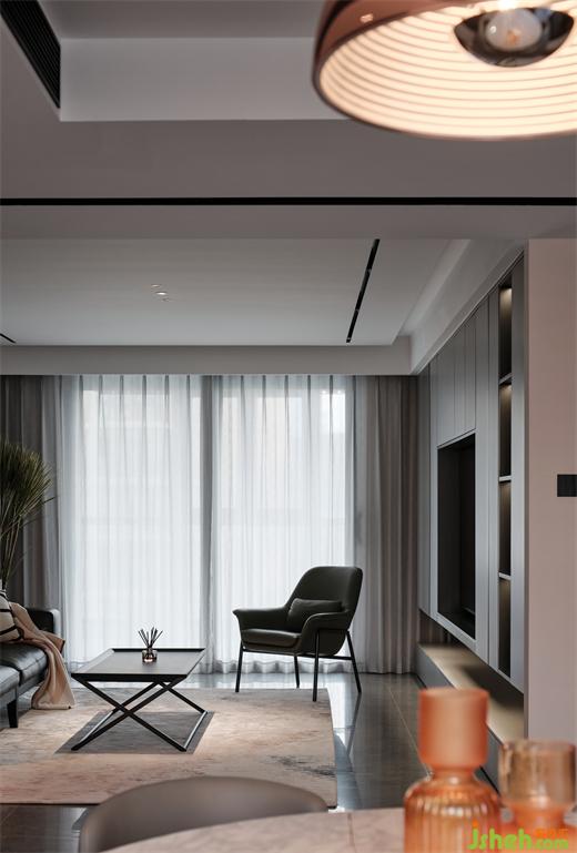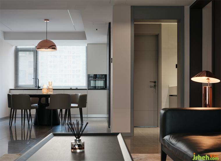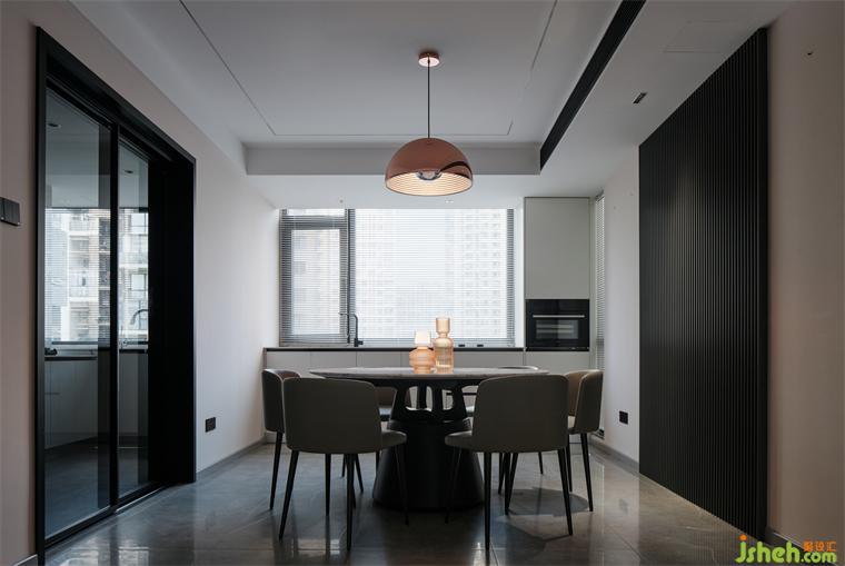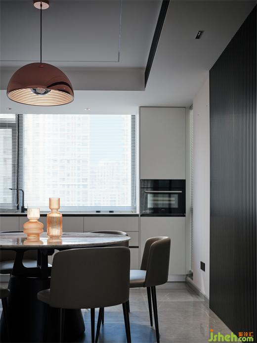餐桌高度協(xié)同西廚操作臺,預(yù)留出開闊的窗景視野,純白基調(diào)之外增添黑調(diào)格柵飾面,既是穩(wěn)定空間體感的媒介,又是簡約藝術(shù)的表達,四周同色系的元素,卻形態(tài)各異,大平層裝修設(shè)計詮釋了大道至簡的美。