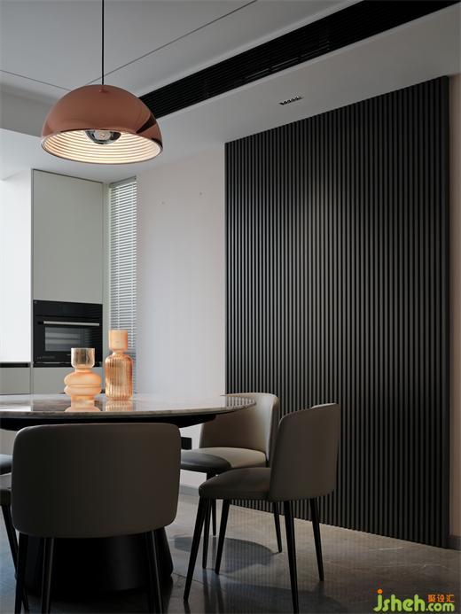 以半球形吊燈展開呼應(yīng)意趣,先用包裹式造型賦予人輕松坐感,同時合圍出適宜的動線,再提取暖融色溫與精致花瓶的美,透過磨砂質(zhì)感與靈動視感,升華就餐的享受性,于空間互望之時,串聯(lián)起家人之間的情感。