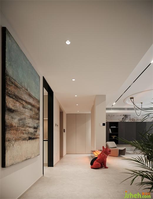 采用純色基調(diào),編排立面紋理與柱體光影,作輔助效果襯托跳色雕塑,隨廊道的延伸,汲取不同場域的性格,點(diǎn)綴一幅抽象油畫,以景應(yīng)景,拓展了藝術(shù)情趣。The use of pure color tone, layout of the facade texture and column light and shadow, as an auxiliary effect to foil the color jumping sculpture, with the extension of the corridor, absorb the character of different fields, embellishment of an abstract oil painting, to match the scene, expand the artistic interest.