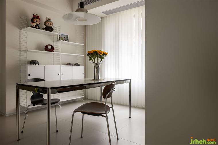 餐廳色彩的明度和純度與空間整體風(fēng)格相協(xié)調(diào),讓家始終充滿一種朝氣。金屬材質(zhì)的餐桌椅泛著清冷的光澤,結(jié)合造型簡約的燈飾與柜體,既充滿文藝氣息又不失生活溫度。