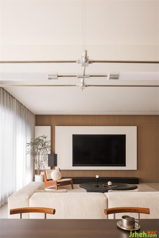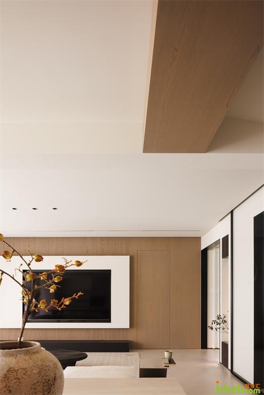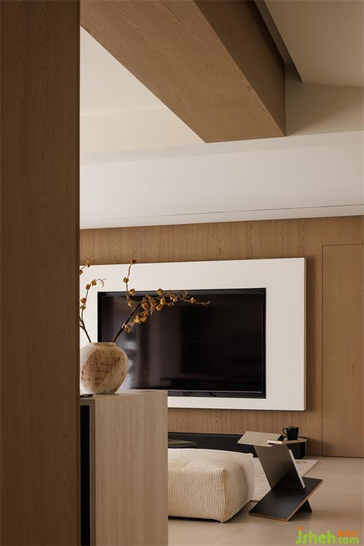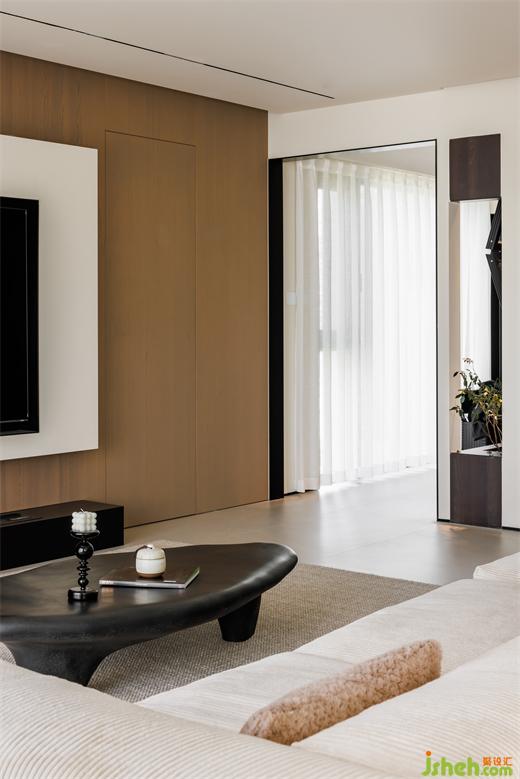 客廳沒有選擇整墻木飾面,避免空間顯得沉悶。大平層設(shè)計(jì)將門隱藏并化為電視背景墻的一部分,簡(jiǎn)潔精致,視覺上完整性也更強(qiáng),每一處細(xì)節(jié)都透露著對(duì)生活品質(zhì)的追求和對(duì)美學(xué)的尊重。