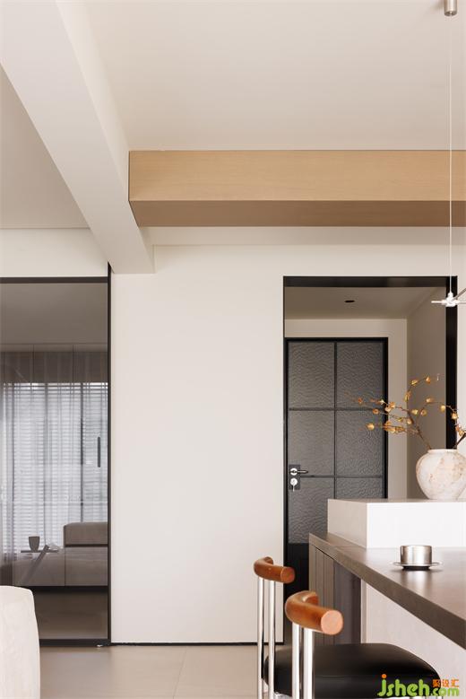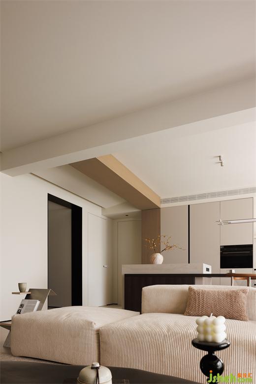 大平層設(shè)計(jì)木飾面從客廳頂部延續(xù)至餐廳,使得色調(diào)上形成較好關(guān)聯(lián),避免了大面積墻體的單調(diào)感,入眼即舒心。