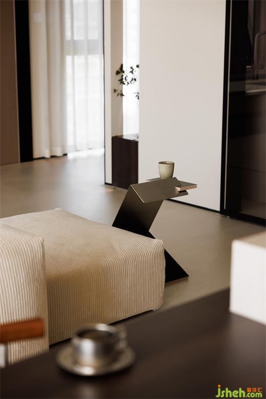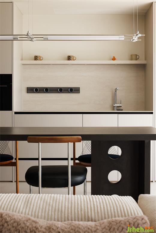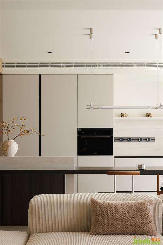 餐廳做了黑胡桃木+奶白色的島臺,兩種顏色的碰撞,使空間更富有想象力。