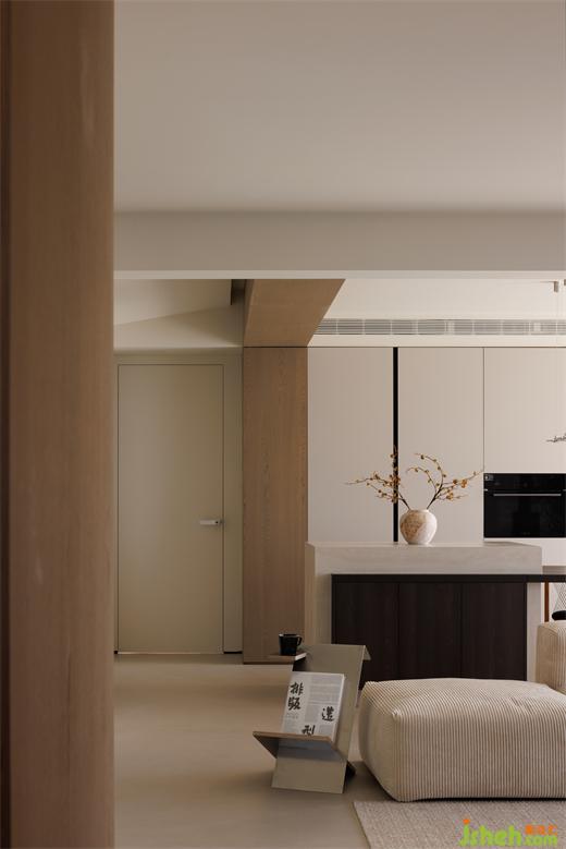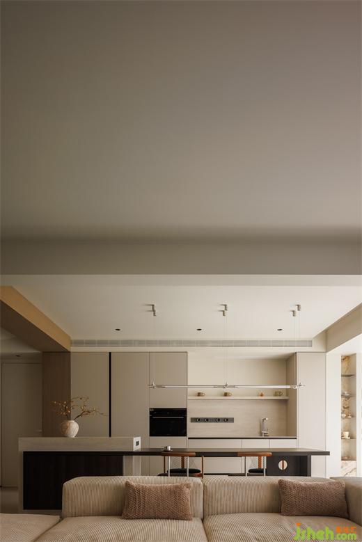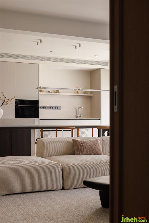 廚房在客廳一側(cè),于開放式的空間中梳理出流暢的行走動線,提高了家的自由度。