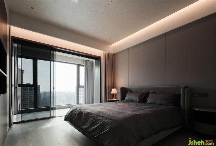 柔和的灰色可以營造平靜的氛圍,用于臥室背景色最適合不過。陽臺與睡眠空間用一扇黑玻移門進(jìn)行阻隔,它既有玻璃的通透輕盈,又帶著黑色的神秘深邃。