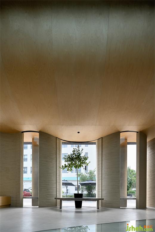 豎向線條由密集轉(zhuǎn)換為稀疏,展露分區(qū)。咖啡廳設(shè)計劃分圓的四分之一作進出入口,降低室內(nèi)溫度的流失率,更明確地指引人流方向。