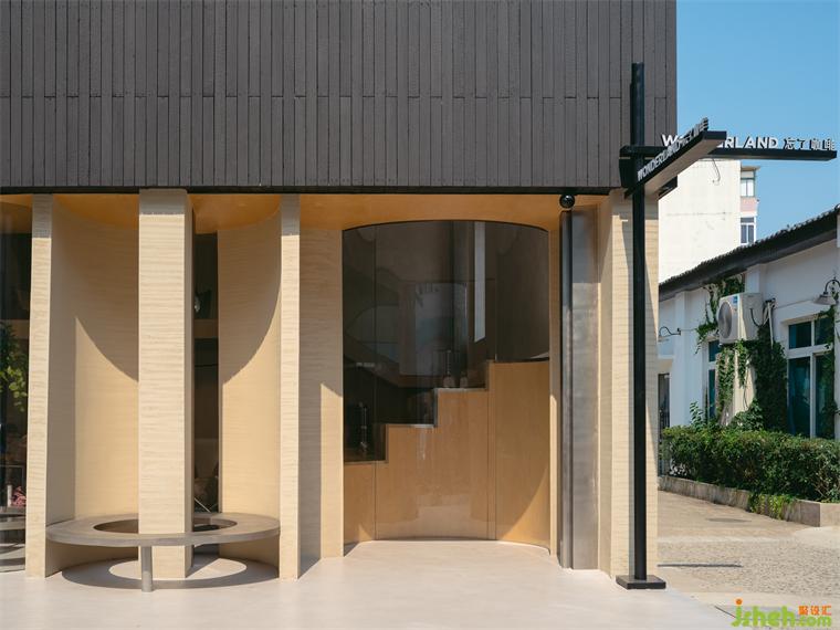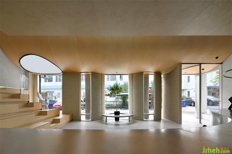 過濾掉原有門窗的形象,橫向排布五個圓形,咖啡廳設(shè)計加以立體式拉伸處理,結(jié)合內(nèi)外聯(lián)動,環(huán)環(huán)相扣出特色鮮明的一層外立面,穿插弧形玻璃合圍室內(nèi)空間。