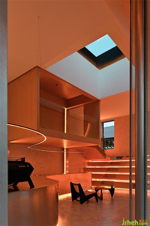 考慮到質(zhì)感自帶的情緒影響力,結(jié)合建筑架構(gòu)的嚴(yán)謹(jǐn)屬性,匠造出光影氛圍??Х葟d設(shè)計(jì)構(gòu)建懸掛式獨(dú)立空間,串聯(lián)梯臺(tái)的流暢動(dòng)線,營造悠然通透的感覺。