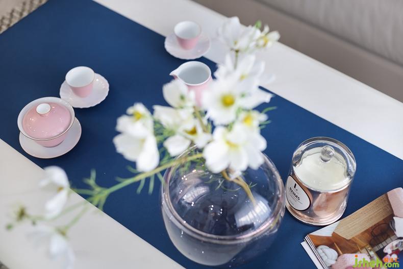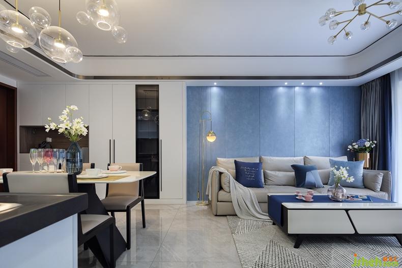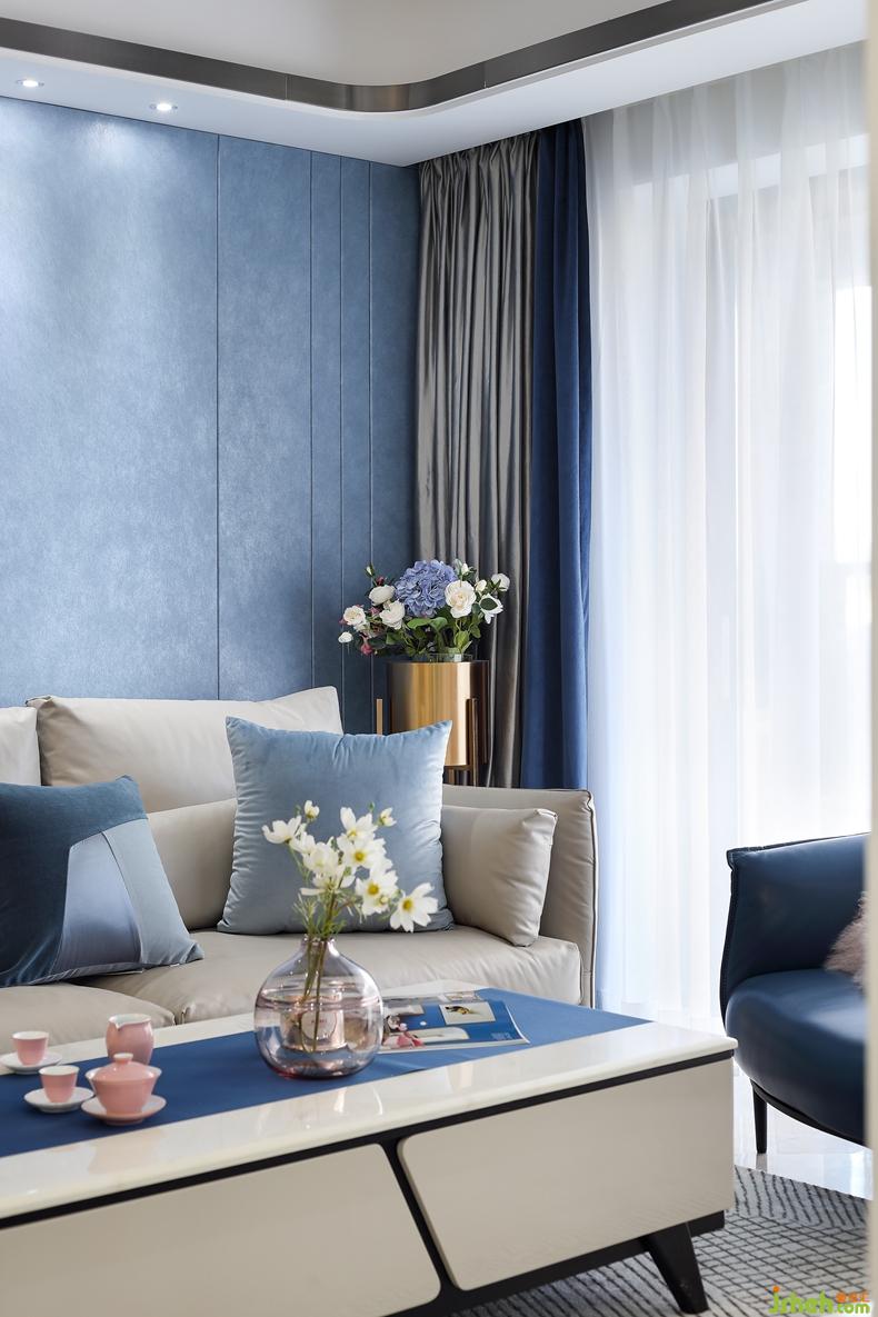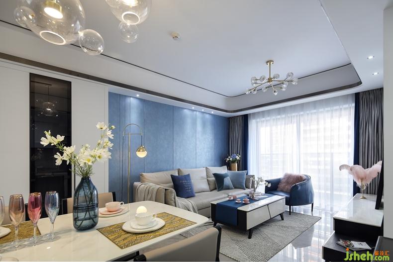 客廳的沙發(fā)背景墻采用了雅致的藍色硬包,與電視背景墻的白色形成強烈的視覺沖擊,使空間富有層次。在偏冷的基調(diào)上,恰到好處的是水晶球般的落地?zé)?,暖暖的光線,暈開了空間的冷調(diào),將家的溫度絲絲沁入其間。
