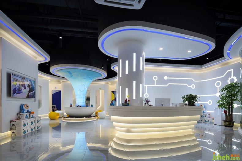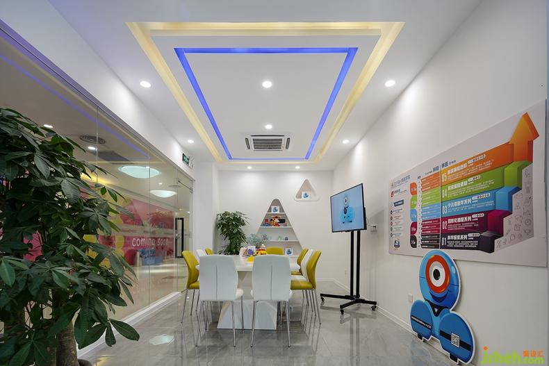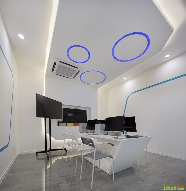 辦公區(qū)的布置十分簡潔利落:潔白的天花頂布上藍(lán)色圓形燈管,白色平行四邊形的書桌上擺著黑屏白底電腦,灰色和白色的椅子相互穿插……一切都剛剛好。