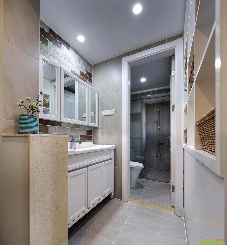 大浴室三室隔離,還有一整面儲(chǔ)物柜,充分利用了空間。洗漱臺(tái)前的墻磚留有咖啡色,散發(fā)著溫暖呵護(hù)的氣息。