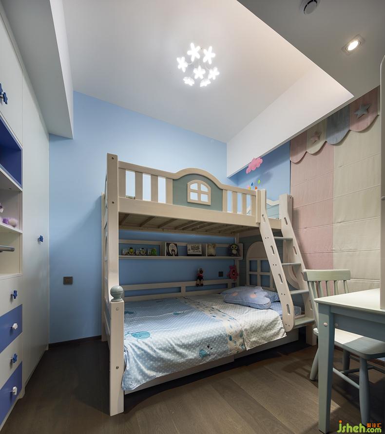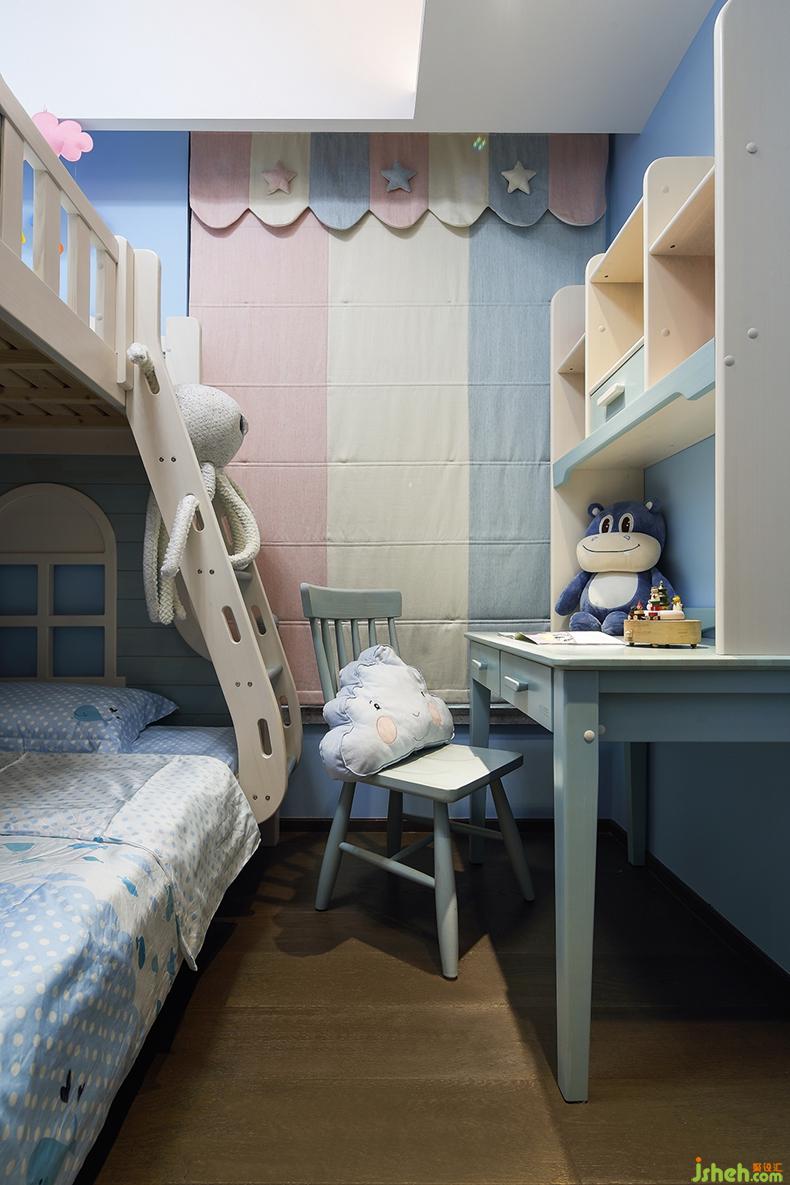 白云藍(lán)天,是自然的呼吸。上下床增加了小朋友的活動空間,其造型也很童趣。淺色系的窗簾和書柜,為空間添上另一抹色彩,整個空間變得很和諧。