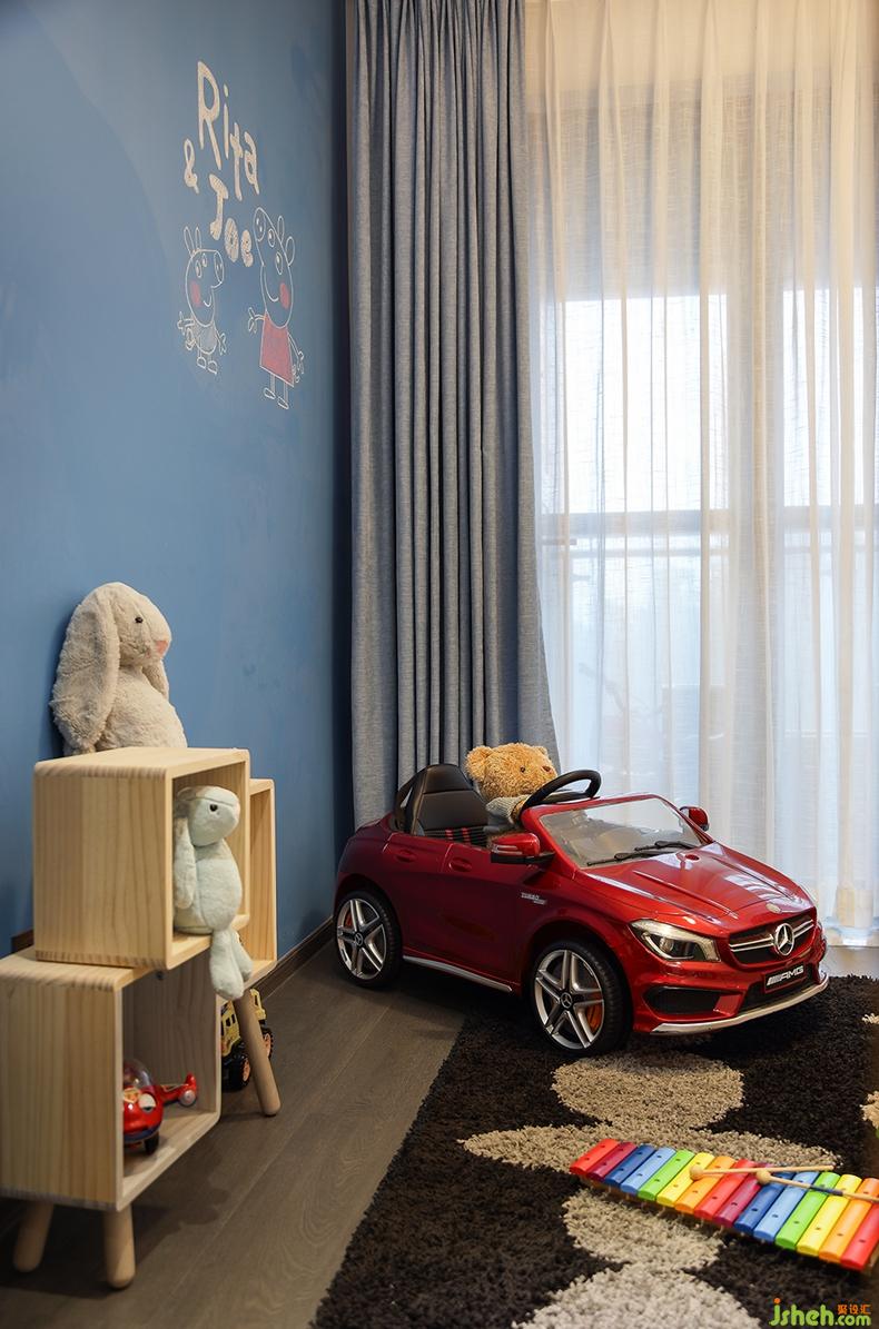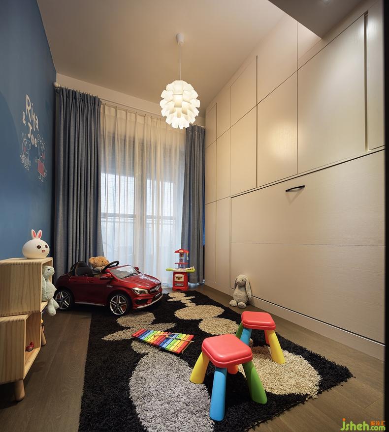 儲物間將一面墻做成藍(lán)色,既能涂鴉又考慮到孩子的視覺感受;對面是米白色的隱藏式柜子,增加儲物空間,既美觀又實用。設(shè)置一道玻璃推拉門,將陽臺和儲物間打通,便于通風(fēng)采光。