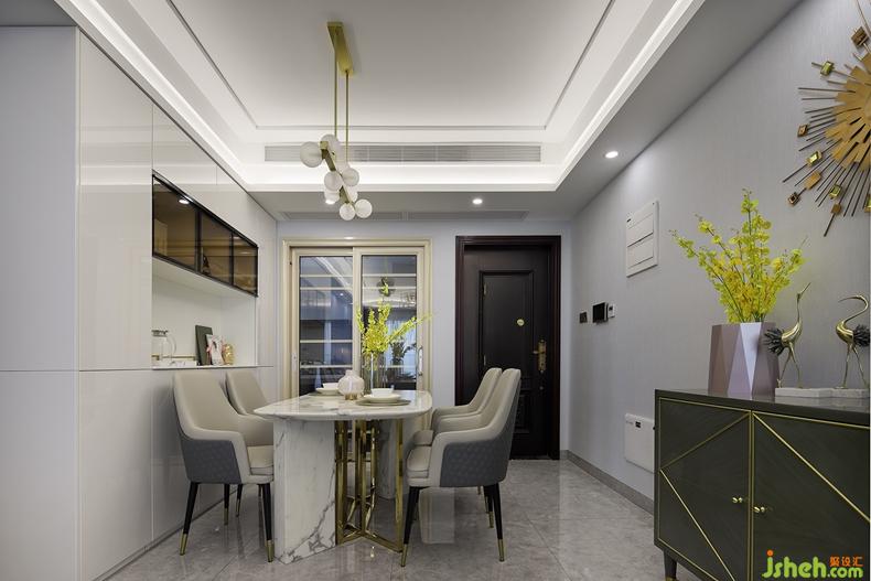 餐廳和廚房之間用活動(dòng)移門對(duì)空間進(jìn)行劃分,獨(dú)立便捷又完整。此外,設(shè)計(jì)師巧妙的利用墻面,將餐廳的展示、儲(chǔ)藏空間融為一體,不僅能適當(dāng)減輕廚房的收納壓力,還能當(dāng)做備餐區(qū),提高了空間的利用率。
