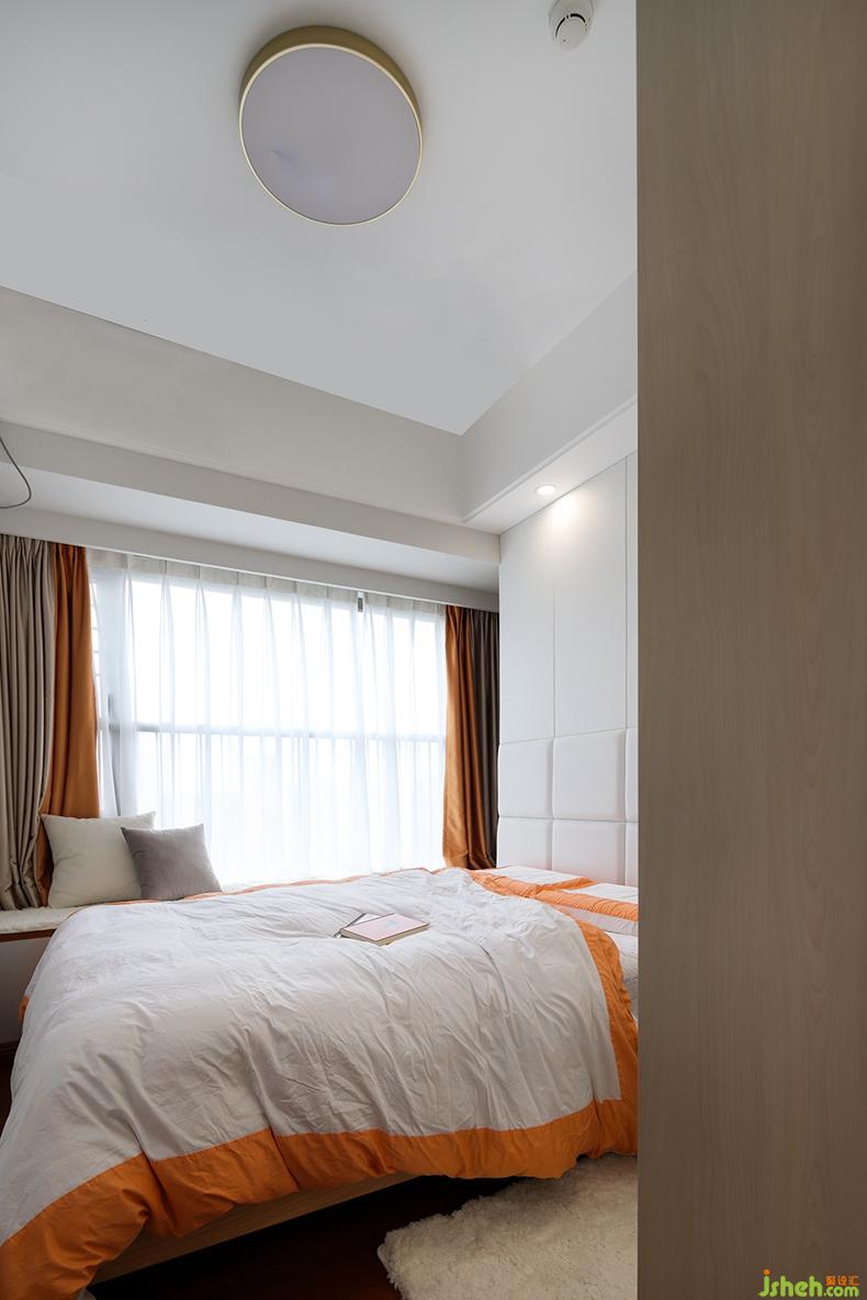 主臥以橙色+白色的床品,搭配同色系窗簾,營(yíng)造出整體清爽、輕松的感覺。飄窗偶有陽光串門,可以一邊慵懶散躺,一邊享受日光浴。