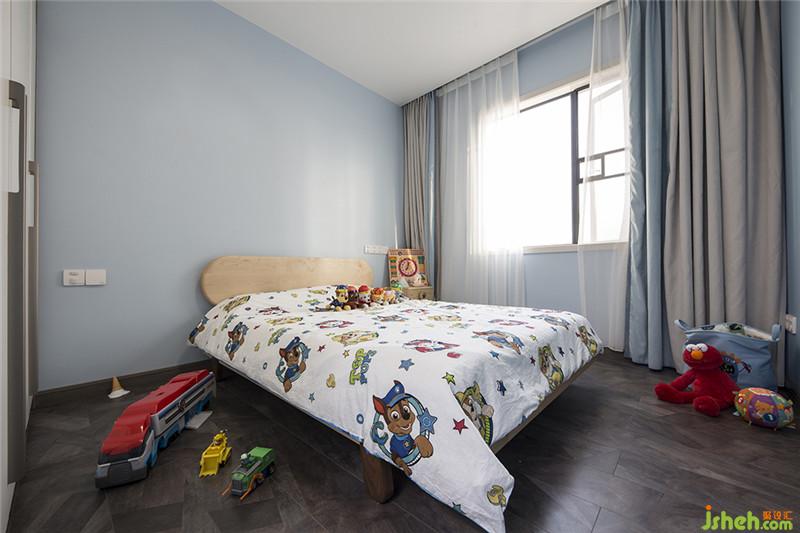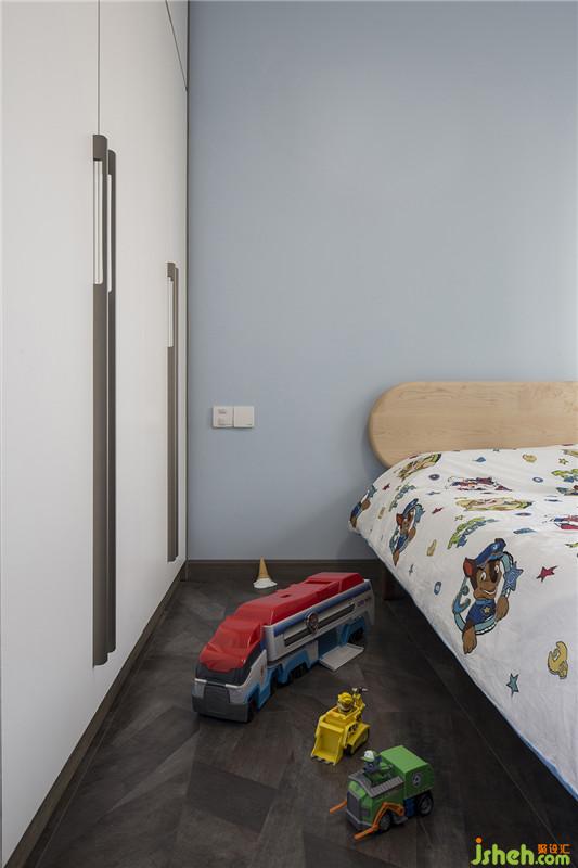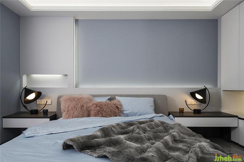 延續(xù)空間、色彩、材質(zhì)搭配的設(shè)計(jì)手法,以白色烤漆面板和灰藍(lán)色墻漆的組合造型作為沙發(fā)背景墻,且在衣柜同比例處安置一條凹位,可以擴(kuò)充空間水平方向的視覺(jué)感,搭配上內(nèi)置的燈帶,整體呈現(xiàn)出浪漫、柔情的感覺(jué),使得主臥空間的層次更加豐富。
