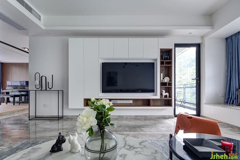 以白色為主色調(diào),地面鋪貼淺棕紋理進(jìn)口大磚,延展溫潤氣息,加之藍(lán)色、紅色作為點(diǎn)綴,使空間更顯清新透亮。溫和感極強(qiáng)的木色消解了整面白色電視柜帶來的單調(diào)感,亦可作為絕佳的陳列臺。