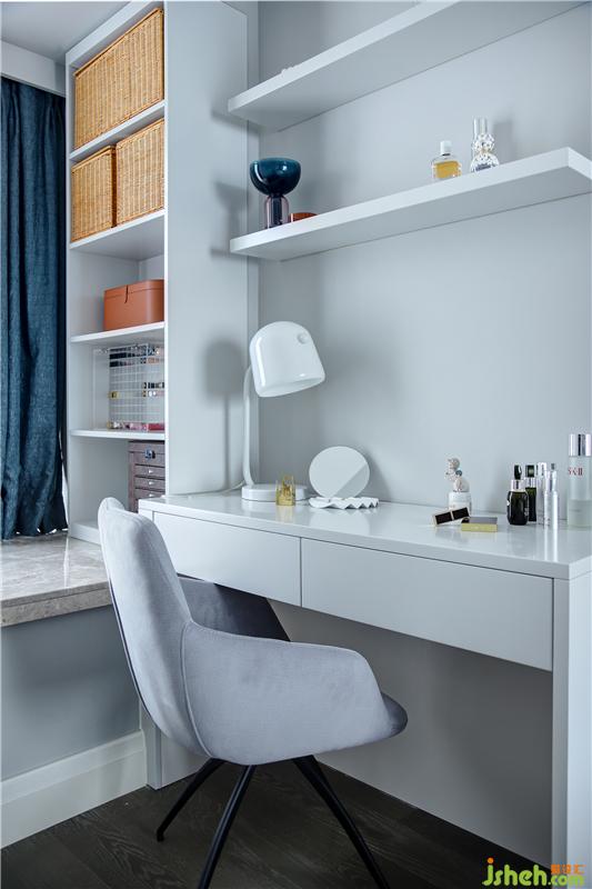 主臥飄窗位置,充分了利用角落空間,依墻角定制一排白色烤漆開放柜,與梳妝臺(tái)一體化設(shè)計(jì),外側(cè)與墻體齊平,松弛有度的布局讓空間井然有序。開放柜方便物品的取拿,梳妝臺(tái)則采用抽屜與擱板結(jié)合的形式,增加了儲(chǔ)物空間,同時(shí)也可用于辦公,寬敞整潔的臺(tái)面不管是化妝還是辦公都能令人心情愉悅??拷斑?,采光也好,閑暇時(shí)可在飄窗上曬曬太陽看看書,也頗有一番趣味。