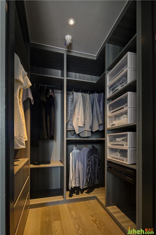 正前方是懸掛區(qū),長(zhǎng)衣、短衣、裙子等均可分類懸掛;左邊是懸掛區(qū)+抽屜區(qū),抽屜區(qū)可放置小的貼身衣物;右邊是格子區(qū)+抽屜區(qū),格子區(qū)放置疊放衣物,抽屜區(qū)放置首飾、貴重小物件;三面最上面的格子可存放換季衣物、棉被等不常用品。合理規(guī)劃后,一切都是那么井然有序。室內(nèi)設(shè)計(jì)師