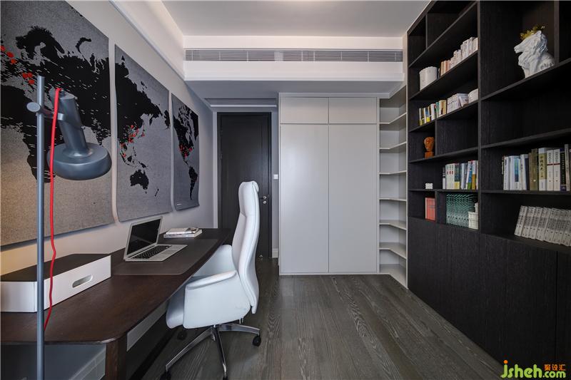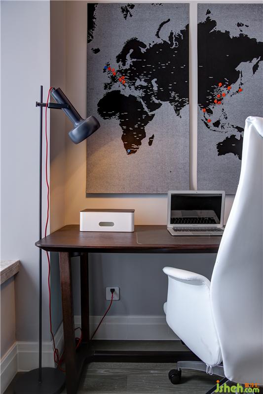 書房一側(cè)懸掛的世界地圖剛好正中業(yè)主心扉,不僅是墻上的裝飾,也是一份擁有回憶的旅行日志。地圖是毛氈材質(zhì),柔軟可熨,觸感奇妙,其上的紅色圖釘則是業(yè)主根據(jù)自己的“征途”布置上的,也悄然襯托著主人的內(nèi)心格局——征服世界!