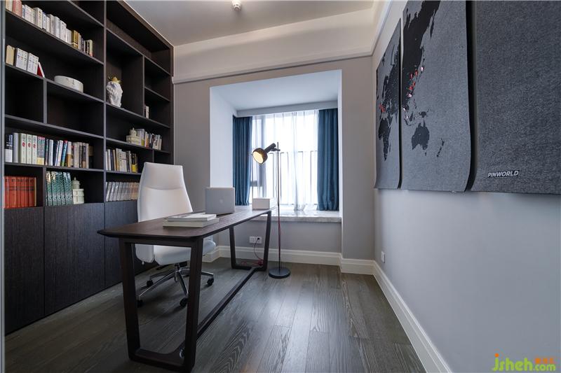 書房進(jìn)門左側(cè)乍一看是到頂?shù)陌咨耋w,其實(shí)可下翻成翻板床,充當(dāng)臨時(shí)休息之用,關(guān)合時(shí)就與柜體融為一體,巧妙又靈活。轉(zhuǎn)角處定制了白色烤漆擱板,旁邊則是棕色滿墻式書柜、儲(chǔ)物柜,收納空間非常豐富,造型簡(jiǎn)約干練,再加上書籍的有序擺置,整個(gè)空間彌漫著書香氣息。
