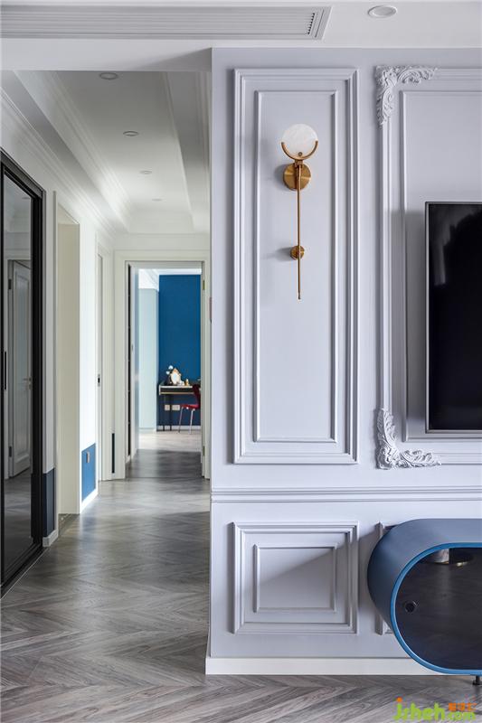 電視墻采用法式輕奢風(fēng)格特有的幾何設(shè)計(jì)元素,通過PU線條的剪裁,打造方正的矩形和疏密有致的線性框架,立體的質(zhì)感也成就了視覺拉鋸,增加了電視墻的藝術(shù)氛圍。以電視為中心營(yíng)造了左右對(duì)稱的平衡感,強(qiáng)化了電視墻的儀式感,而兩側(cè)的環(huán)抱款輕奢壁燈豐富了空間照明的層次,在灰色底漆的襯托下散發(fā)出典雅大氣的光芒。