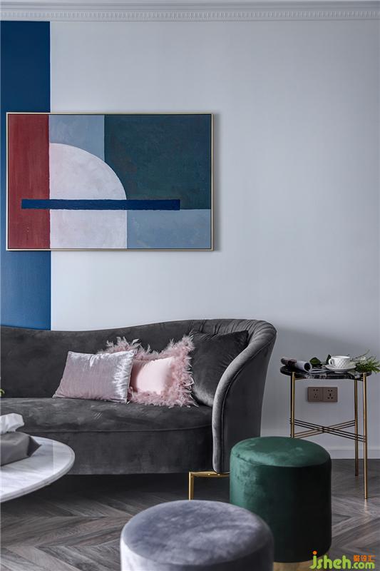沙發(fā)背景墻用簡(jiǎn)約的曲線元素與豐富的色彩過渡打造設(shè)計(jì)的時(shí)尚風(fēng)情。藍(lán)色墻漆與主臥的背景色一致,以過道為延伸,循序漸進(jìn),整體感強(qiáng)。而藍(lán)與白的交界剛好與彩色幾何圖形掛畫分色線重合,以此為界劃分的色域區(qū)也頗有意思,藍(lán)色、紅色、灰色、綠色,恰好是客廳的色系組合!精心布置的家,每一個(gè)細(xì)節(jié)都突破你的期待。室內(nèi)設(shè)計(jì)師