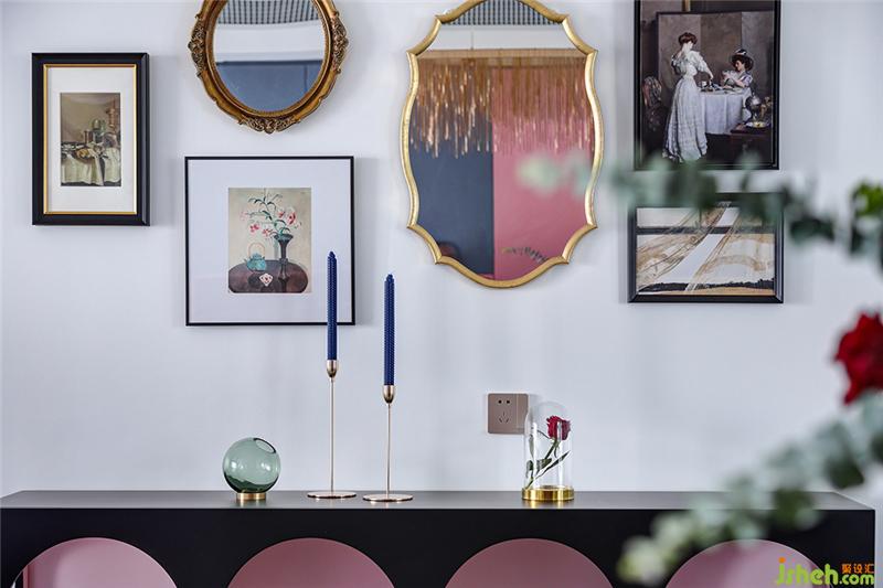 墻面可謂是最好的風(fēng)景展示區(qū),餐邊柜上懸掛六項(xiàng)規(guī)格不一的裝飾,既有家庭場(chǎng)景的復(fù)古油畫又有精致典雅的鏡子,看似毫無關(guān)聯(lián),但都極具生活氣息,精心設(shè)計(jì)過的排列方式也讓餐廳增添了別樣的美感,成為家中一道亮眼的風(fēng)景線。