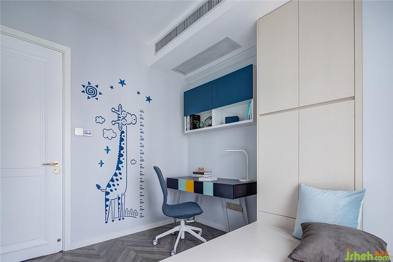 淺藍(lán)色墻面搭配暖白色榻榻米,清新柔和的空間色調(diào)讓書(shū)房更覺(jué)舒適。而門邊的卡通身高墻貼也十分實(shí)用,隨時(shí)記錄著孩子的成長(zhǎng)。