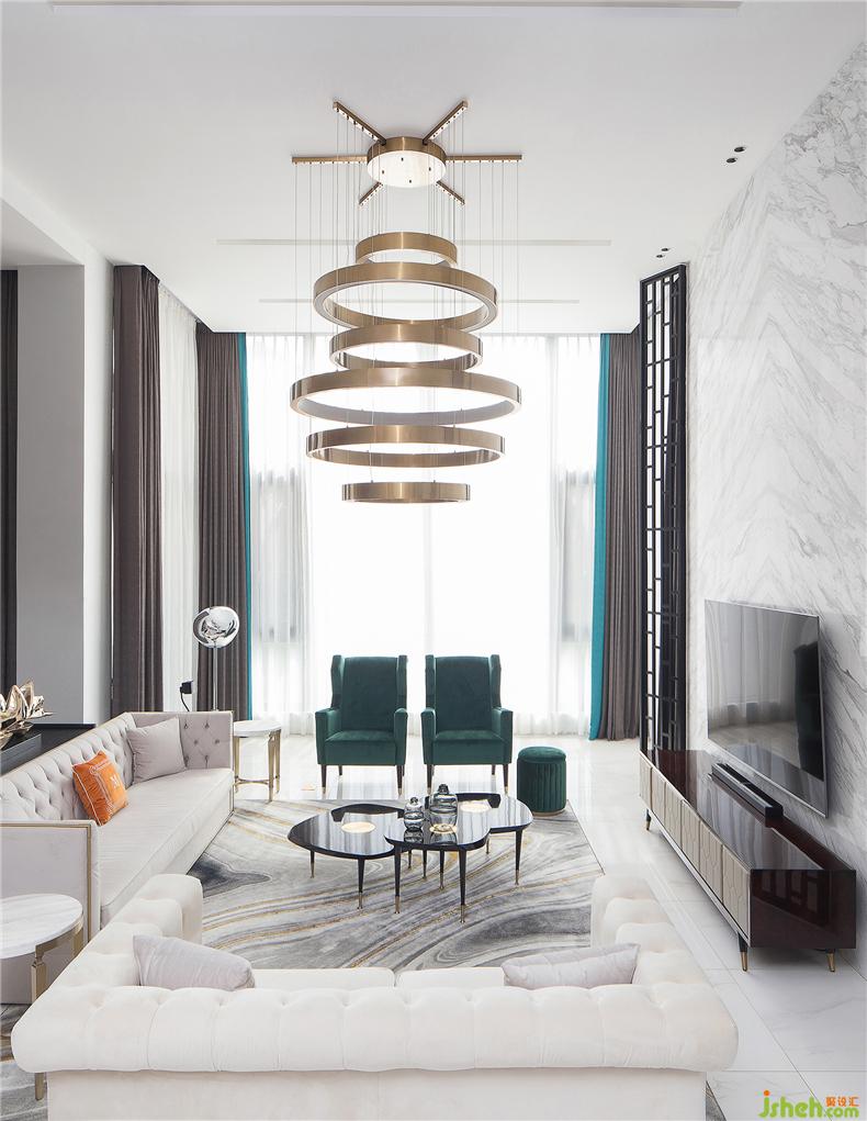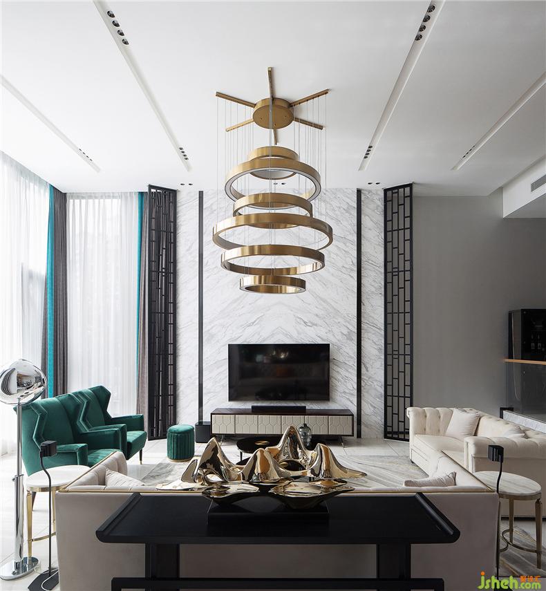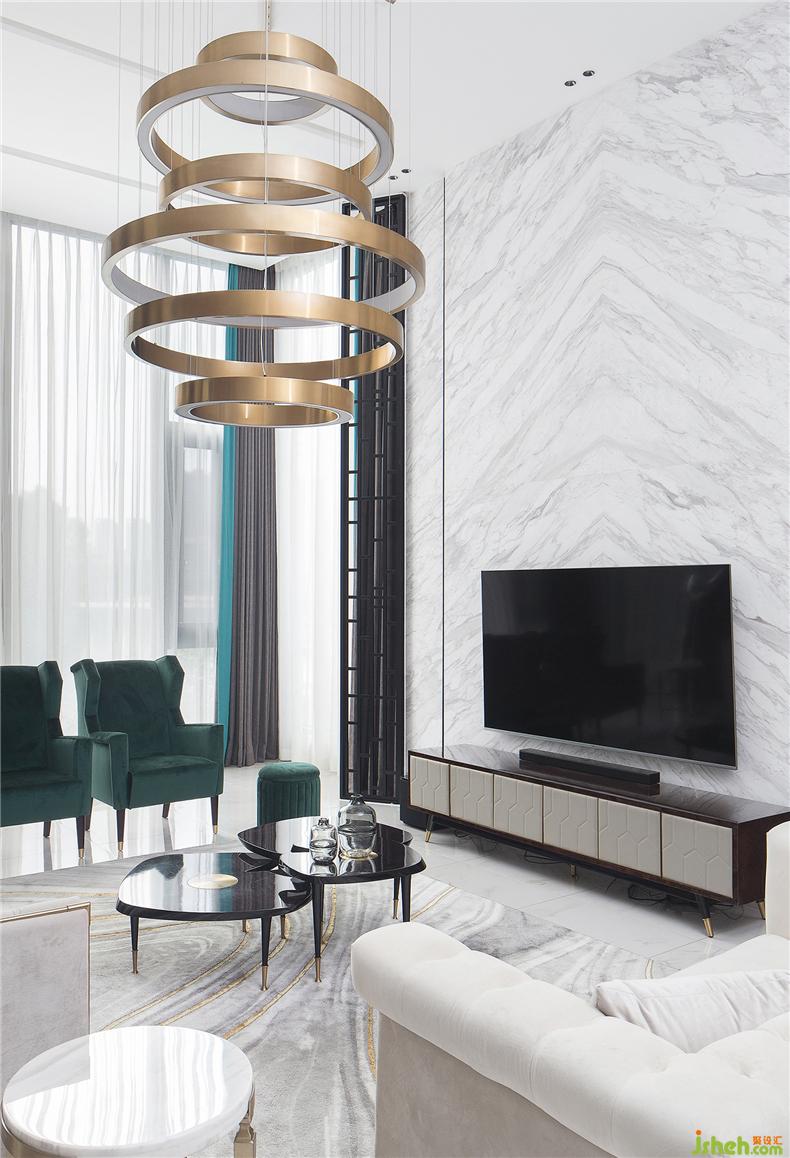 客廳常用于較正式的接待、洽談,特意以線性元素和自然紋理營造典雅、大氣的氛圍。別墅裝飾金屬環(huán)形吊燈懸掛在吊頂上,恰到好處的輕奢感與整體空間的簡約氣氛相中和,避免因空間通透而覺冷清。