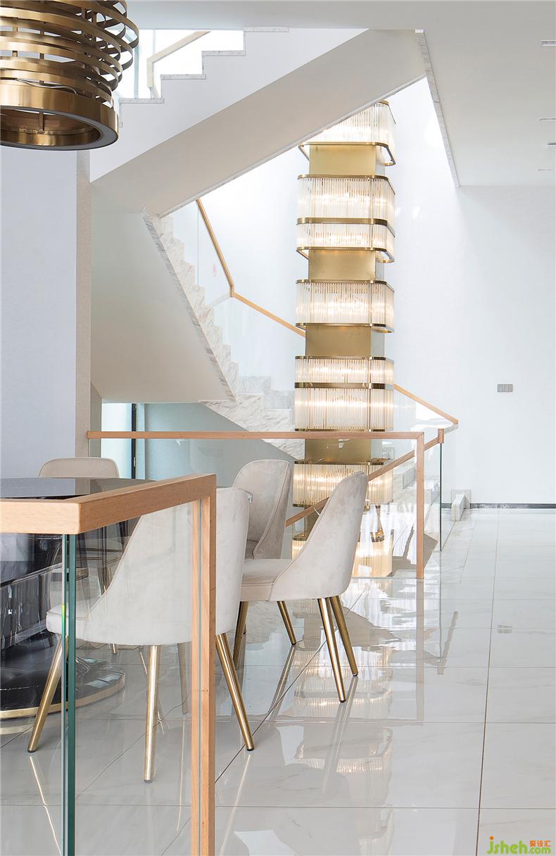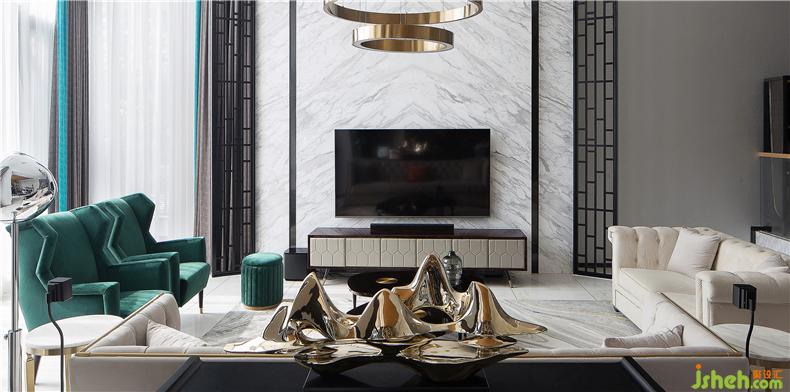 隨著視線轉(zhuǎn)移,天然大理石、絨面座椅、烤漆茶幾、羊毛地毯……每一處都如藝術(shù)品一般值得細細品味。別墅裝飾材料與質(zhì)感的多變豐富了空間層次感,通過色彩的組合過渡,自然地實現(xiàn)了整體平衡的美感。