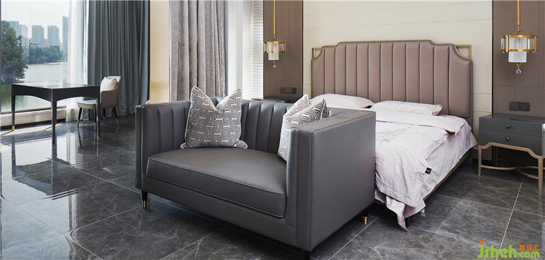 主臥典雅大氣,選用米色、駝色等暖色與高級灰相搭配,通過護(hù)墻板、真皮、大理石的材質(zhì)切換,使空間質(zhì)感更為飽滿。細(xì)節(jié)之處點(diǎn)綴金色光芒,自然而克制的呈現(xiàn)空間精致優(yōu)雅之感。