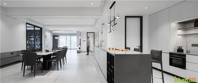 吧臺白色巖板臺面與半封閉式的烤漆柜門相互映襯,吧椅則選用與開放柜同色系的灰色,白灰之間有藏有露,讓空間更為靈動。長吧臺的工藝難度極高,除了收口細(xì)節(jié)需到位外,在12扇柜門之上的臺面還需保持高平整度。