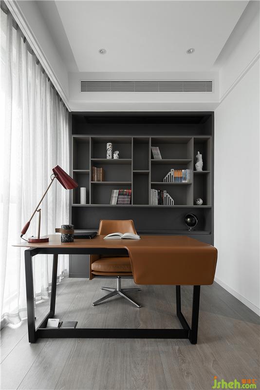 書房以黑色、白色和木色為基調(diào),搭配亮眼的咖色軟裝,以簡潔大氣、有設(shè)計(jì)感的造型讓空間充滿藝術(shù)氛圍。