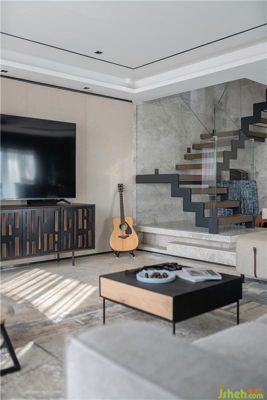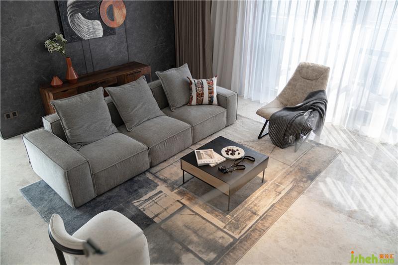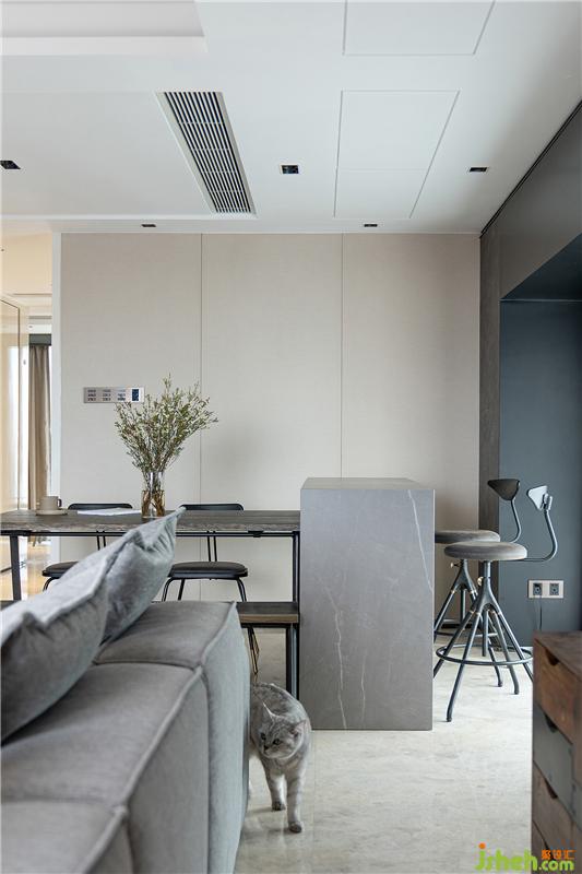 客廳選擇了較多質(zhì)感柔軟、細(xì)膩的家具,給室內(nèi)增添溫馨、舒適的感覺,同時(shí),中和了冷硬的地面與背景墻,展現(xiàn)出工業(yè)風(fēng)的獨(dú)特美感。