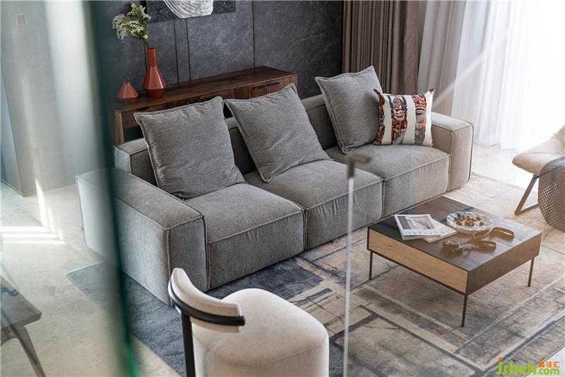 暖灰色布藝沙發(fā)和深色木制儲(chǔ)物茶幾、暖白色休閑椅相當(dāng)搭配,款式新穎又休閑舒適,充滿美好且文藝的氣息。