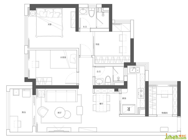在功能方面,將入戶小房間改造為鞋帽間,增加進(jìn)出門的儀式感;打通主臥與小次臥,合并成為主臥套間,兼具休息區(qū)、衣帽間、書房、衛(wèi)浴間的功能,使用更舒適。