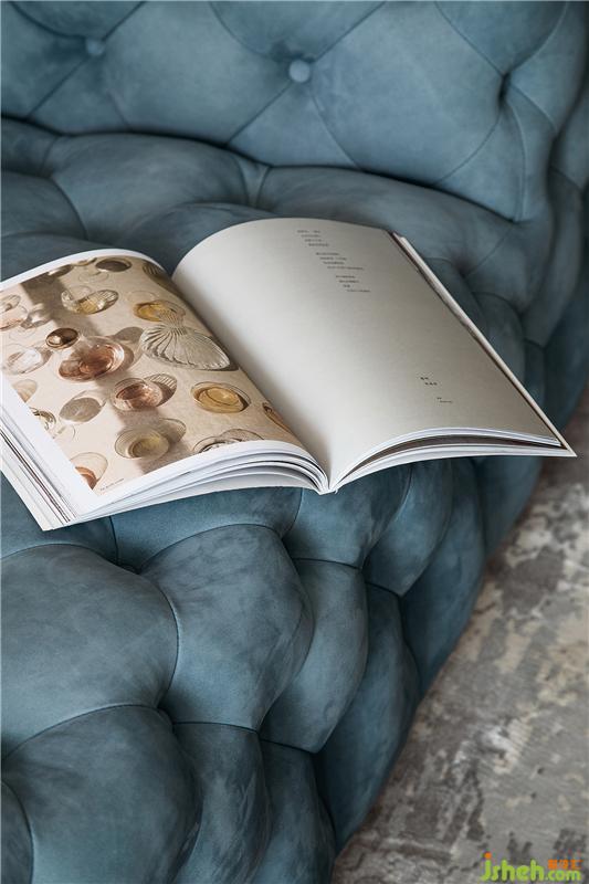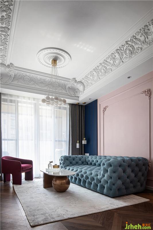 客廳家居設(shè)計(jì)大膽且富有創(chuàng)意,臟粉色和藏藍(lán)色的撞色背景墻,搭配湖水藍(lán)進(jìn)口磨砂皮沙發(fā)和酒紅色麂皮絨單椅,質(zhì)感豐富又極有新意,色彩跳躍又相得益彰。