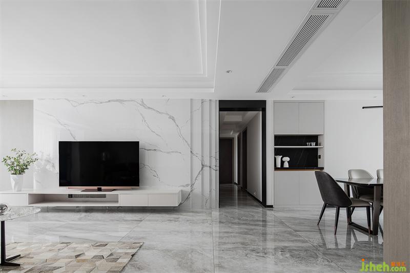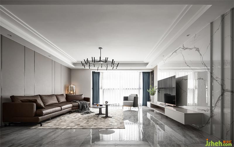 室內(nèi)以簡練、優(yōu)雅、舒適為設(shè)計核心,通過材質(zhì)、色彩、線條等元素,構(gòu)建清爽、舒適的生活空間。公共區(qū)域地面通鋪大理石紋磚,天花以周邊吊頂形式將空調(diào)與筒燈藏于其內(nèi),立面則以暖灰色皮質(zhì)硬包與淺色大理石紋磚作為材質(zhì)及顏色之間的碰撞,凸顯空間開闊、大氣之感。