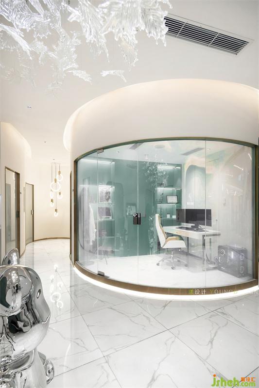 空間以純凈的白色作為主色調(diào),搭配優(yōu)雅神秘的復(fù)古綠,用色彩純度形成的色塊構(gòu)成立面造型;以柔和流暢的弧形帶動(dòng)視線轉(zhuǎn)移,順勢(shì)而為的異形造型則將空間巧妙貫穿;搭配電子霧化玻璃和多重光源,打造時(shí)尚個(gè)性、優(yōu)雅輕奢的商業(yè)空間。