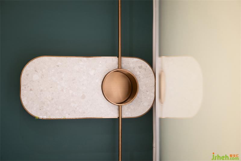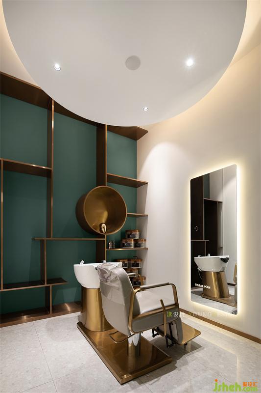 VIP室延續(xù)整體輕奢基調(diào),以復(fù)古綠為主背景墻色,側(cè)面設(shè)計(jì)了造型簡(jiǎn)約但實(shí)用的開(kāi)放式金屬置物架,必要的鏡面也巧妙置入其中。家具的選擇也十分講究,強(qiáng)化了造型的簡(jiǎn)約性及金屬色的相互呼應(yīng),營(yíng)造出空間靜謐、優(yōu)雅的氛圍。