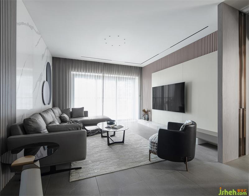 坐感舒適的深灰色L型真皮沙發(fā),搭配淺灰色窗簾和淺灰咖色幾何圖案地毯,在淺灰色地磚和背景墻的襯托下,有一種遠(yuǎn)離城市喧囂的休閑氛圍。