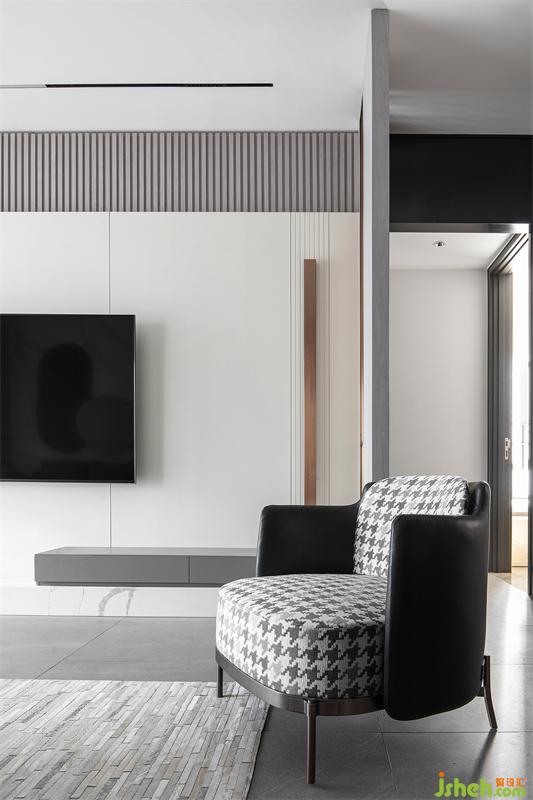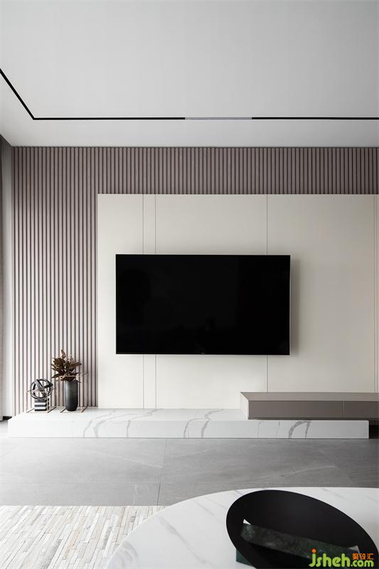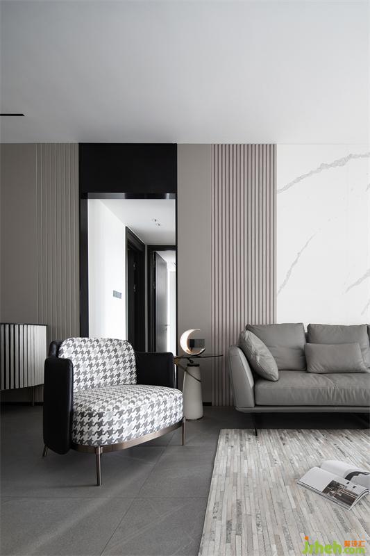 時(shí)尚個(gè)性的黑白灰基底,穿插使用優(yōu)雅的灰咖色,構(gòu)成了客廳空間的色彩基礎(chǔ)。電視背景墻富有層次,由大理石+木擱柵+混油護(hù)墻板構(gòu)成,自下而上根據(jù)黃金比例進(jìn)行造型設(shè)計(jì)。