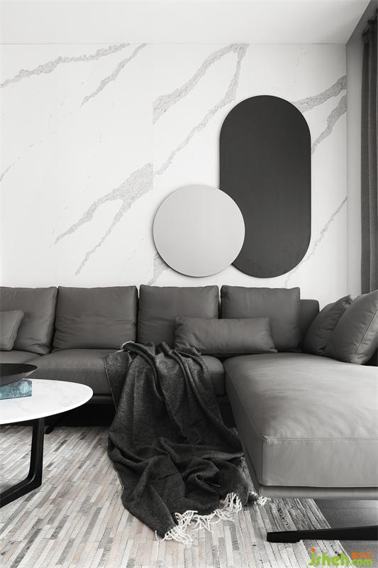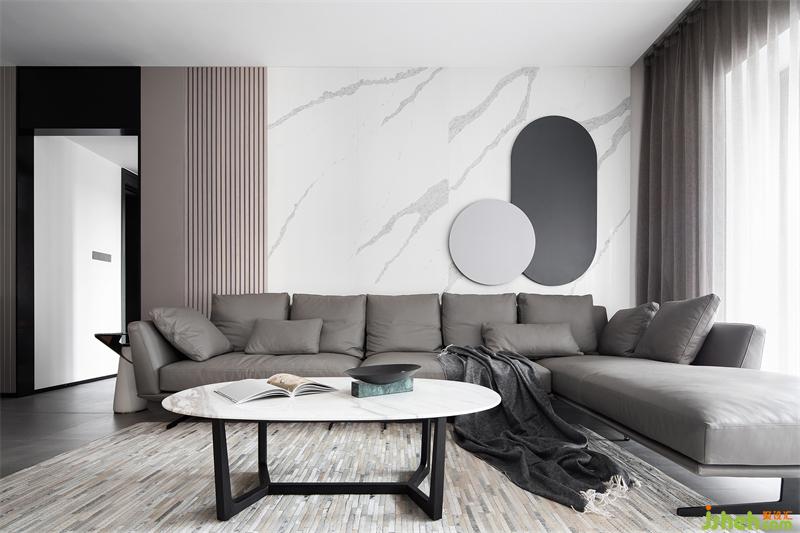 沙發(fā)背景墻由清晰紋理的淺色巖板+灰咖色木格柵及硬包構(gòu)成,其上不再以掛畫作為裝飾,而是由一對(duì)圓形鐵藝相互疊加凸顯局部亮點(diǎn)。