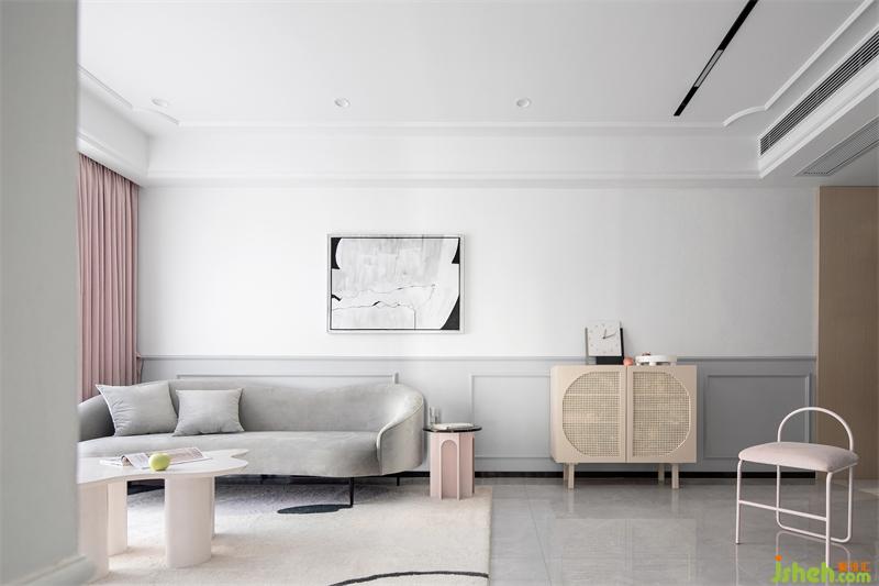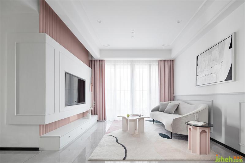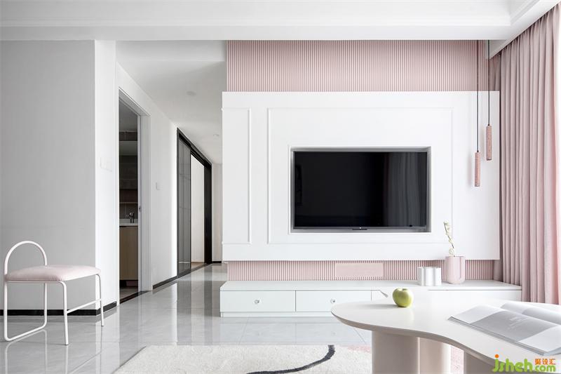 客廳電視墻采用幾何線條與塊面穿插的設(shè)計(jì)手法,以臟粉色格柵做銜接,結(jié)合白色相框型護(hù)墻板和白色電視柜,形成連而不斷的視覺(jué)感。電視墻上下留空減輕視覺(jué)壓抑感,電線設(shè)備等隱藏在電視機(jī)后方,打開內(nèi)嵌燈帶,點(diǎn)亮一室溫柔。