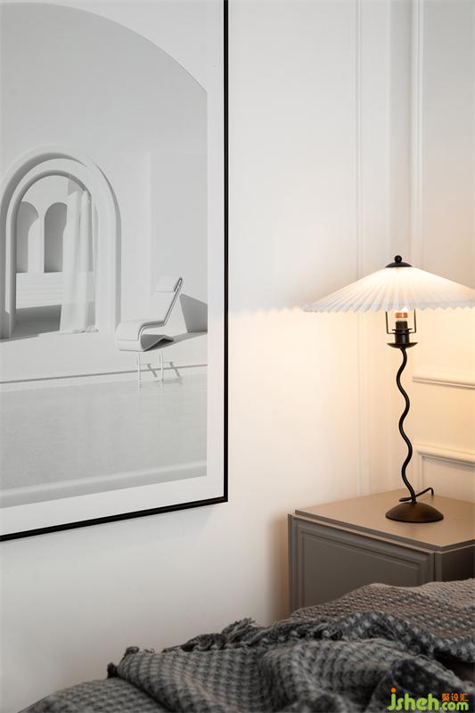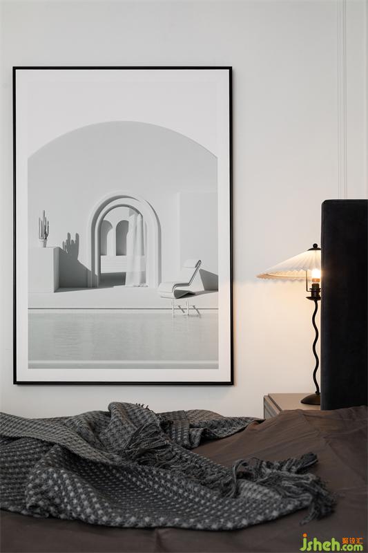主臥延續(xù)整體簡(jiǎn)約但有細(xì)節(jié)的基調(diào),以乳白色石膏線條為背景造型,搭配深咖色高背床和高級(jí)灰色床頭柜,支一盞藝術(shù)傘狀臺(tái)燈,加一幅黑白灰抽象掛畫(huà),于色調(diào)深淺之間,藝術(shù)儒雅的氛圍感悄然流露。