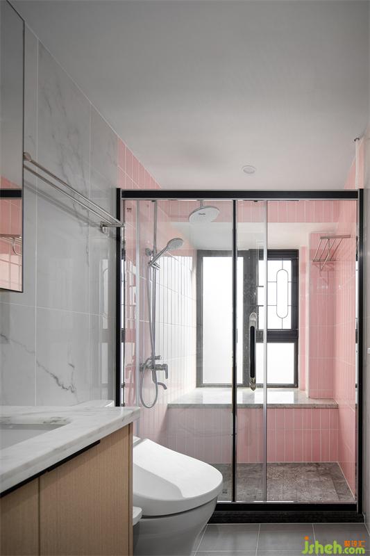 衛(wèi)生間采用站式淋浴、干濕分離的設(shè)計(jì),以玻璃推拉門(mén)隔斷,干區(qū)選擇高級(jí)灰色的墻地磚組合,濕區(qū)空間中融入臟粉色作點(diǎn)綴,小塊墻磚令人眼前一亮,溫柔又純凈。