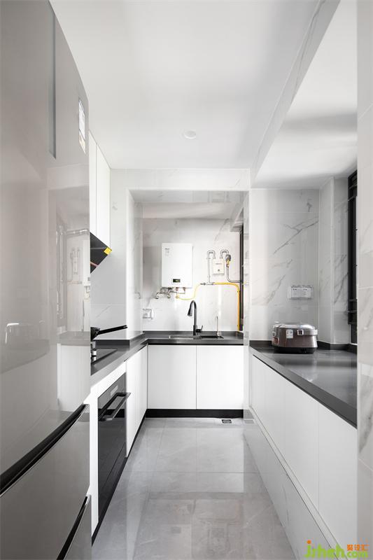 將小陽(yáng)臺(tái)納入廚房區(qū)域,里處是水盆區(qū),兩側(cè)分別備餐區(qū)和烹飪區(qū),L型廚房秒變U型廚房,使用面積大大提升。用長(zhǎng)虹玻璃隔絕油煙,搭配白色櫥柜+黑色大理石臺(tái)面,簡(jiǎn)單又純粹。