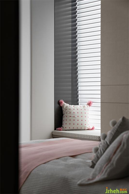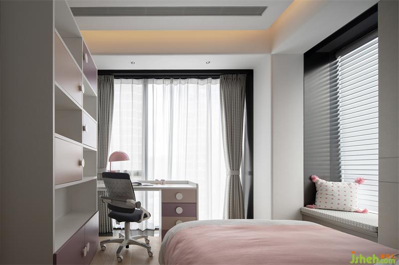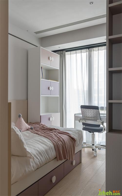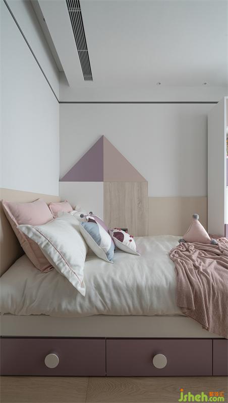 另一女兒房采用ESPERO(埃斯佩羅)定制一體床的設(shè)計(jì),深圳豪宅設(shè)計(jì)以定制拼色護(hù)墻板作為床頭背景,節(jié)省了床頭靠背空間,令床尾能加設(shè)書柜與書桌,滿足空間功能性。粉色、紫色與原木色的色彩組合,在日光下散發(fā)著溫暖的氣息。
