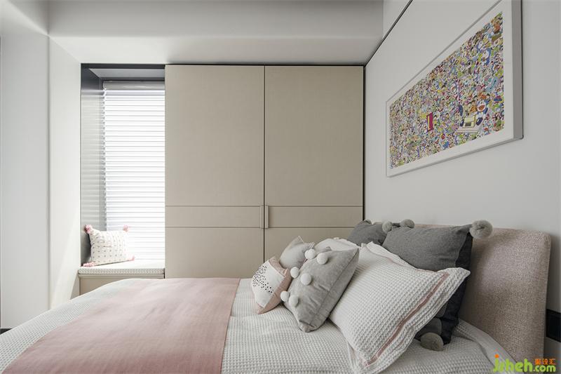 女兒房墻面留白處理,搭配藝術(shù)家村上隆的作品作為裝飾畫,床品點(diǎn)綴女兒喜歡的粉色,床尾加設(shè)ESPERO(埃斯佩羅)定制兒童書柜與書桌,提升空間功能性。深圳豪宅設(shè)計(jì)衣柜柜門是定制巴士門,軌跡范圍小,平移開合不占空間,美觀大氣又極具藝術(shù)性。在光影的調(diào)和下,靜謐柔美的基調(diào)延伸至整個(gè)空間。